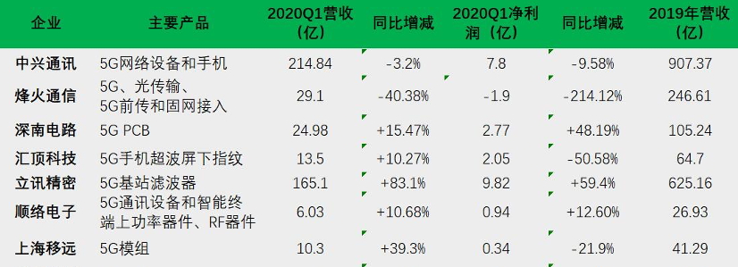 2020年Q1  5G部分上市公司業(yè)績狀況